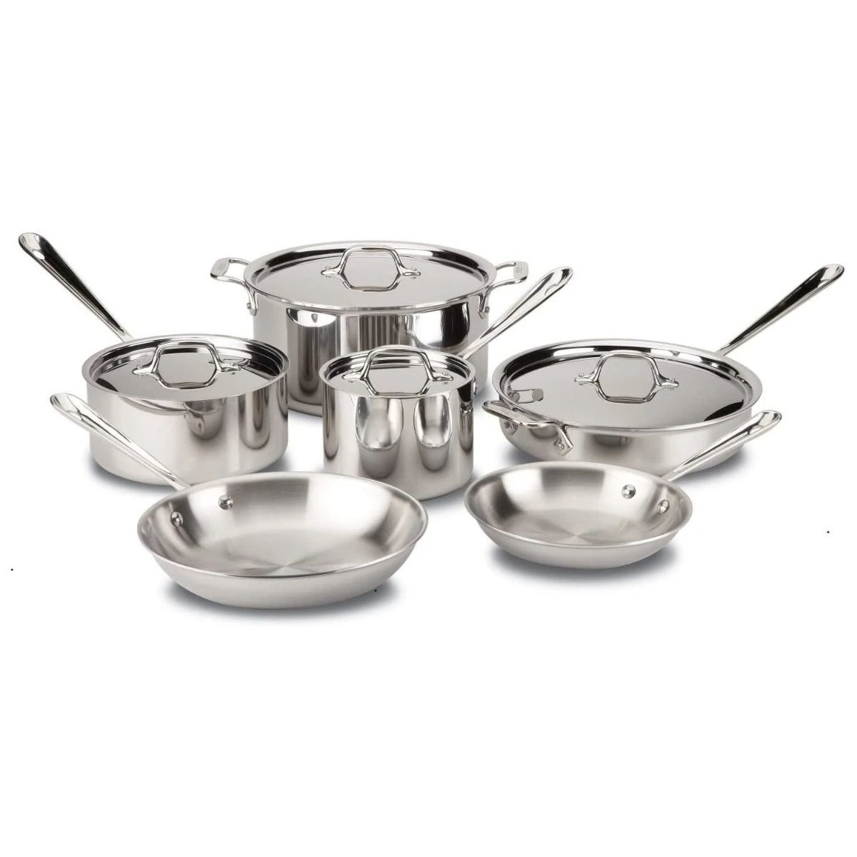 The All-Clad Stainless Steel 10-Piece Cookware Set is made with high quality 18/10 stainless steel and try-ply construction throughout each pan. These brilliant stainless steel pans deliver even heat distribution without hot spots. All-Clad stainless steel cookware sets have superior stick resistance from their star burst finishing on the interior of each pan. All-Clad pans have stainless steel handles that are permanently secured with stainless steel rivets. This fantastic stainless cookware set includes 8-inch and 10-inch fry pans, a 2-quart sauce pan with lid, a 3-quart sauce pan with lid, a 3-quart sauté pan with lid and an 8-quart stock pot with lid.