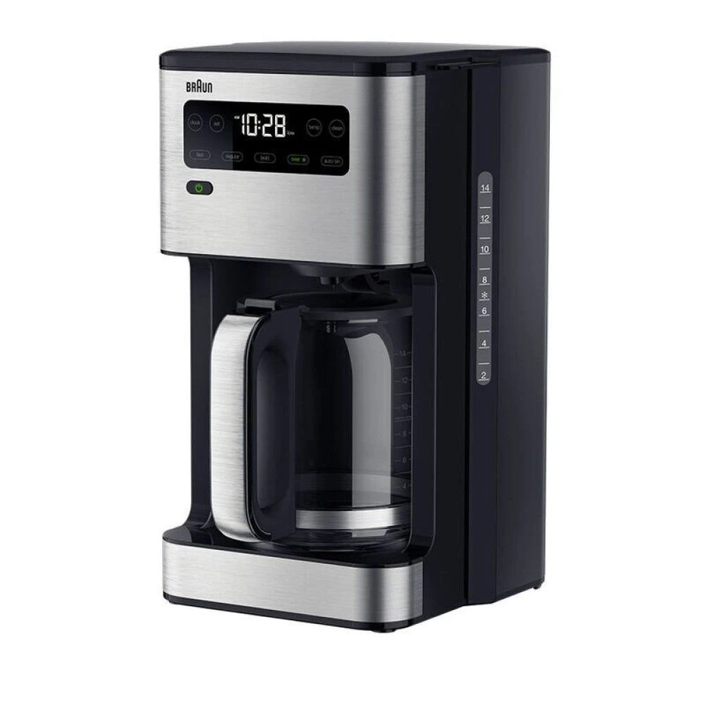 Start your mornings with a perfectly brewed cup of coffee that suits exactly your preferences with the Braun PureFlavor Coffee Maker! Featuring an intuitive display with a simplified touchscreen interface, this coffee maker allows for 24-hour customizable programming – making busy weekday mornings run smoother & leisurely weekend mornings all the more relaxing. With four brewing options, you can choose between Fast, Regular, Bold, or Over Ice. Equipped with PureFlavor technology, each brew will be perfectly extracted with preserved aromas and bold flavors, even when brewing over ice – ensuring no cup is ever watered down or lacking in flavor. The SteadyTemp warming plate keeps coffee at the ready for longer, with three heat settings that can be maintained for up to 4 hours. Finished in a sleek black plastic construction with stainless steel details in a compact design, this coffee maker makes a sophisticated statement on your countertop between uses while taking up minimal space. To simplify your mornings, prepare coffee with the Braun PureFlavor Coffee Maker!