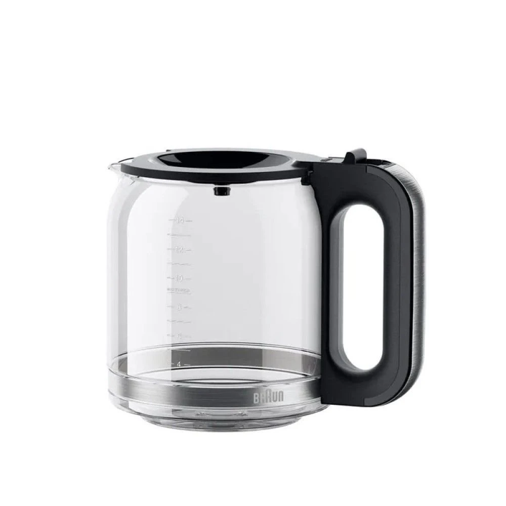 - Glass carafe features stainless steel accents to match the coffee maker